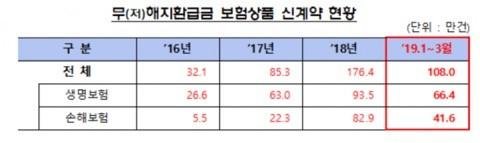 무(저)해지환급금 보험 판매건수(신계약)는 2016년 32만여건, 2018년 176만여건, 2019년 1~3월 108만건으로 급증하고 있다.