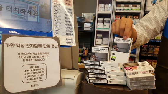 GS25는 보건복지부 등 관계부처가 지난 23일 액상형 전자담배의 사용을 중단할 것을 강력히 권고한 다음 날인 24일 모든 매장에서 KT&G의 '시드 툰드라' 1종, 쥴랩스코리아의 '트로피칼', '딜라이트', '크리스프' 3종 등 총 4종의 액상형 전자담배 판매를 중단했다.