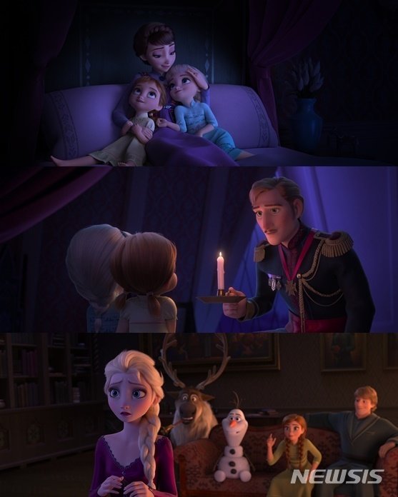 부모님의 이야기를 호기심 어린 눈으로 경청하는 엘사와 안나의 어린 시절 모습은 시선을 사로잡는다. 엄마와 아빠가 각각 무슨 이야기를 전하고 있을지 궁금증을 자아낸다.