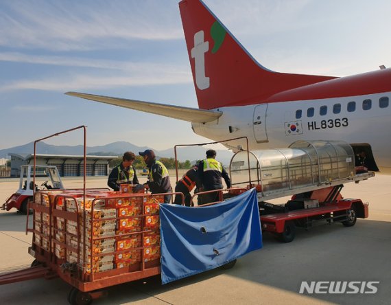 대구를 출발해 제주공항에 오전 11시께 도착한 TW805편에는 과일 등 2t 정도의 화물이 제주도민들에게 전달됐다.