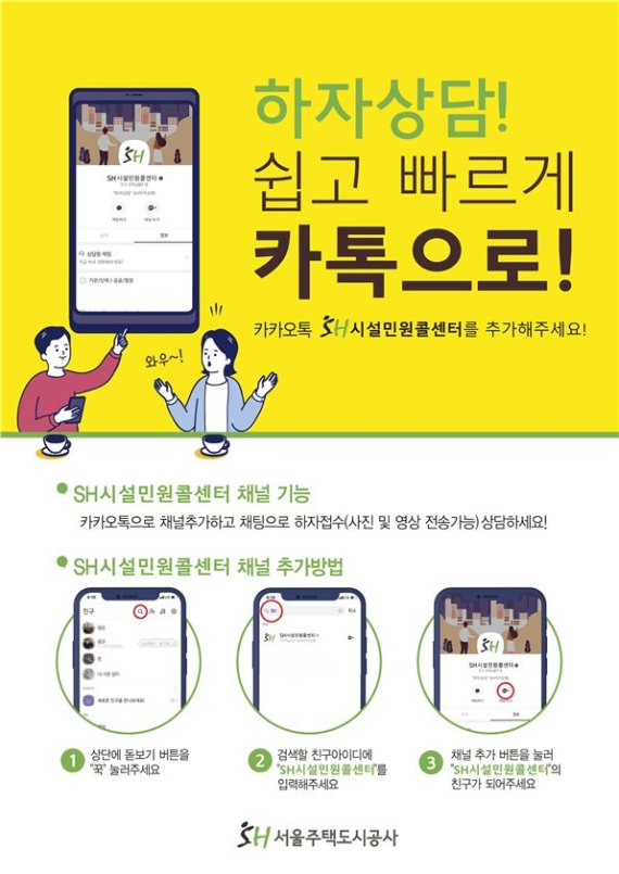 한편 '카카오톡을 통한 하자상담' 서비스는 카카오톡 채널에서 'SH시설민원콜센터'를 검색한 뒤 채널을 추가하면 이용 가능하다.