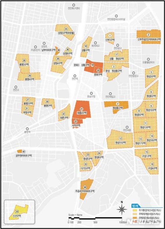 29일 천안시의회 자유한국당 권오중 의원이 천안시에 요청한 '천안시 재개발, 재건축 현황' 시정 질문 답변서에 따르면 현재 천안지역 도시주거환경 정비 사업은 재개발 29개소, 재건축 5개소, 주거환경 개선사업 2개소 등 36개소가 진행 중이다.