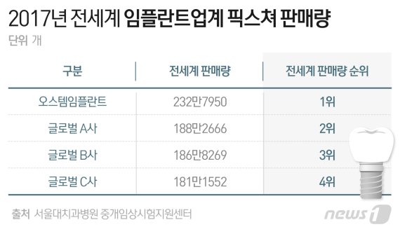 서울대학교 치과병원 중개임상시험지원센터가 지난 5월 글로벌 임플란트 시장 픽스쳐(Fixture·치아뿌리 형태 인공치근) 판매량 조사 결과를 발표한 것도 주목할 만하다.