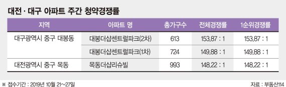 1일 분양업계에 따르면 지난주 10월 넷째 주 대전·대구에서 선보인 분양 단지들은 1순위 청약에서 100대 1을 훌쩍 넘어섰다. 또한 이번주 청약이 마감된 대전의 한 대단지는 최고청약경쟁률이 200대 1을 넘어서는 기염을 토했다.