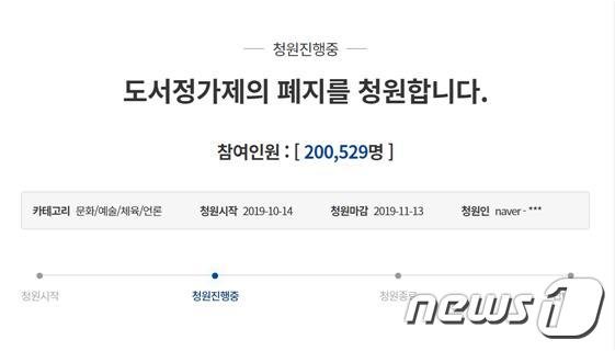 지난달 14일 게시된 '도서정가제의 폐지를 청원한다'라는 제목의 청원글은 2일 오전 20만529명의 동의를 받았다. 청와대 국민청원은 20만명 이상의 동의를 받을 시 청와대와 정부 관계자들에게 청원종료일로부터 한 달 이내에 답변을 받을 수 있다.