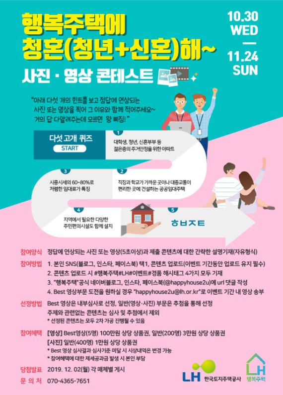 이번 ‘행복주택에 청혼해’ 콘테스트는 오는 24일까지 진행되며, 일반(영상·사진) 부문은 추첨을 통해, 베스트 영상은 내부 심사를 거친 후 오는 12월2일 최종 당선작을 선정할 예정이다.