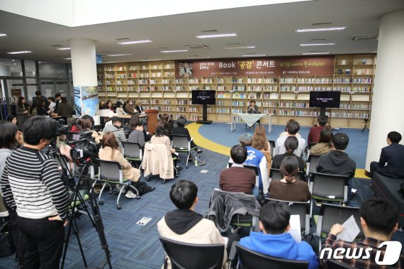 (성남=뉴스1) 김평석 기자 = 가천대학교가 6일 김연수 작가를 초청해 대학 자작나무 라운지에서 재학생 및 지역주민 200여명이 참석한 가운데 Book ‘공감’ 콘서트를 개최했다.