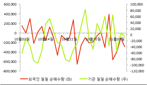 다음 표는 동종목의 외국인, 기관의 일별 순매수량을 나타낸 것이다.