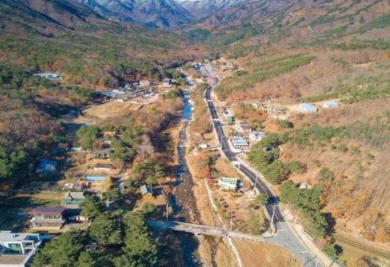 28일 고성군은 강원도 고성군 토성면 도원~원터 군도6호선 확장공사가 지난 21일 준공되면서 백두대간의 생태와 자연을 탐방할 수 있는 도원휴양지의 접근성이 개선됐다 고 밝혔다. 사진=고성군 제공
