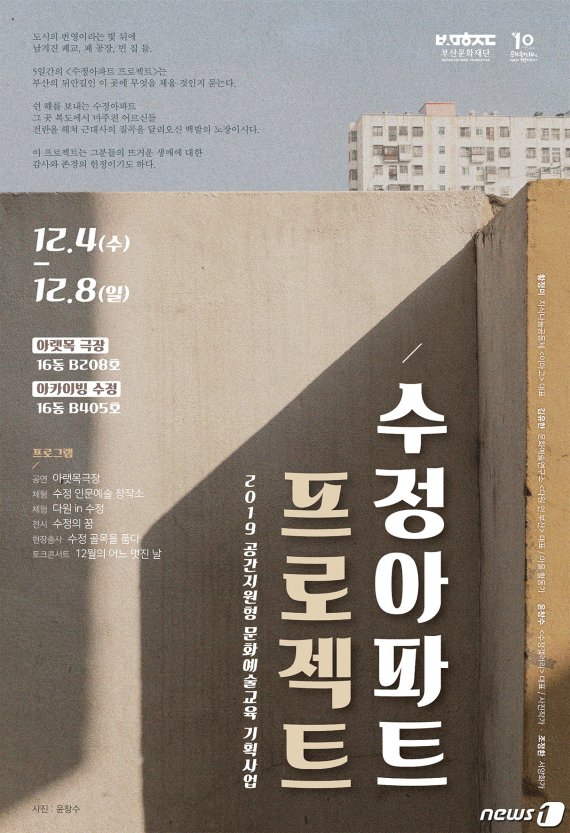 (부산=뉴스1) 박채오 기자 = 부산문화재단은 4일부터 8일까지 부산 동구 수정동의 수정아파트 16동에서 '수정아파트 프로젝트' 프로그램을 운영한다고 1일 밝혔다.