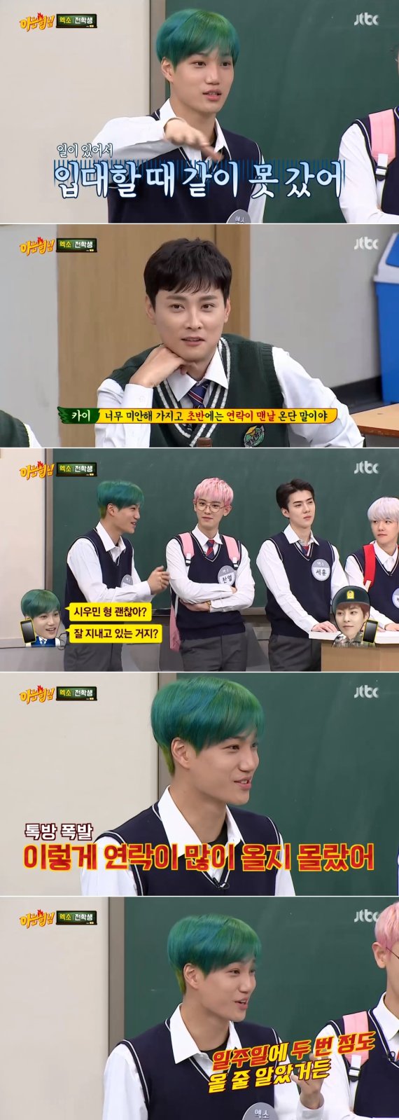 카이는 "시우민 형 군대 갈 때 못가서 매일 답장했다”라고 말했다. 이어 "근데 이렇게 많이 연락올 지 몰랐다"라며 "일주일 내내 와서 요즘 좀 씹는다"라고 밝혀 웃음을 자아냈다.