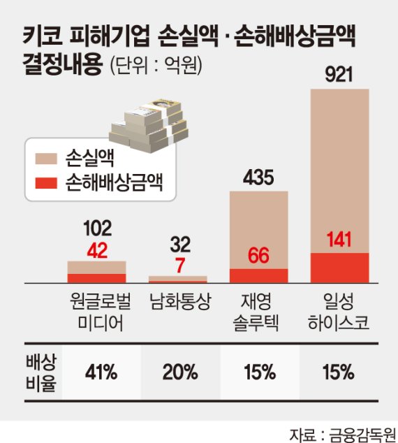 13일 금융감독원에 따르면 전날 열린 분조위 결과 분쟁조정을 신청한 일성하이스코, 남화통상, 원글로벌미디어, 재영솔루텍 등 4개 키코 피해기업에 대한 배상비율을 15~41%로 결정했다. 이들 4개 키코 피해기업 손실액은 총 1490억원이며, 각각의 배상비율을 적용하면 총 손해배상액은 255억원이다. 4개 기업 중 원글로벌미디어는 가장 높은 배상비율 41%를 적용, 42억원을 배상하라고 결정했다.