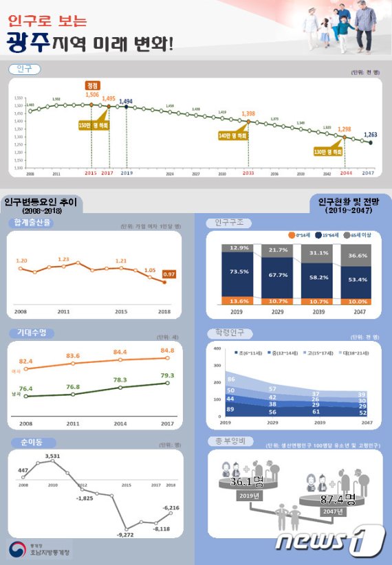 18일 호남지방통계청이 내놓은 '인구로 보는 호남권(광주, 전남, 전북, 제주) 미래 변화' 자료에 따르면 광주 인구는 2015년 150만6000명으로 정점을 찍은 이후 지속적으로 감소하고 있으며 2019년은 149만4000명으로 전국 대비 2.9%의 비중을 차지하고 있다.