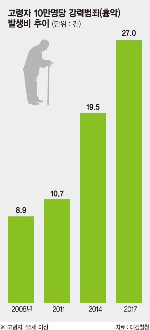 대검찰청이 발표한 '2018 범죄분석'에 따르면 지난 10년간 전체 범죄의 연령별 발생비 가운데 30~40대 범죄자 발생비는 감소한 반면 61세 이상 노인범죄자의 발생비는 51.7% 증가했다. 특히 고령자의 강력범죄(흉악)의 발생비는 지난 2008년 고령자 인구 10만명당 8.9건에서 꾸준히 증가해 지난 2017년 27건으로 최고치를 기록했다.