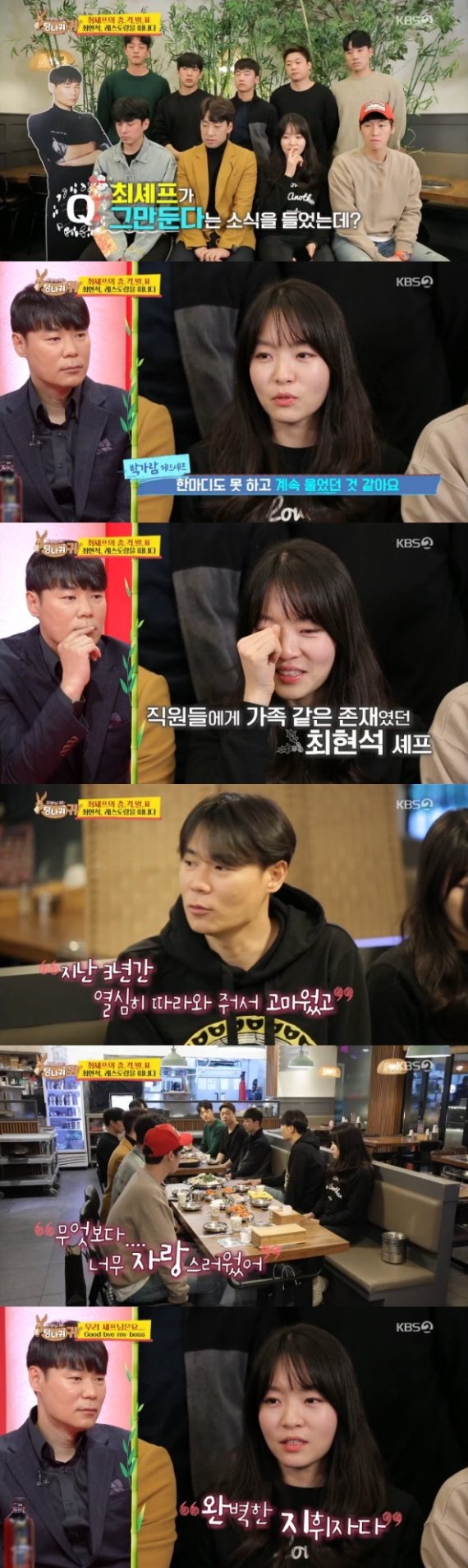 (서울=뉴스1) 김민지 기자 = 레스토랑 직원들이 셰프 최현석과 이별을 앞두고 눈물을 쏟으며 그가 '좋은 보스'라는 사실을 알렸다.