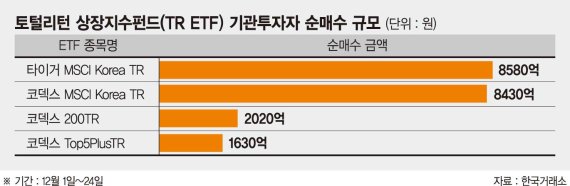 이 기간 순매수 상위 1·2위는 각각 'TIGER MSCI Korea TR'와 'KOEDX MSCI Korea TR'이다. 기관은 이들을 각각 8580억원어치, 8430억원어치 순매수했다.