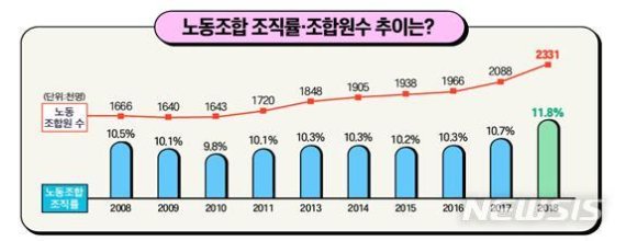 노조 조합원 수는 2001년 156만9000명, 2008년 166만6000명에서 2017년 208만8000명으로 늘어나 처음으로 200만명을 넘겼다.