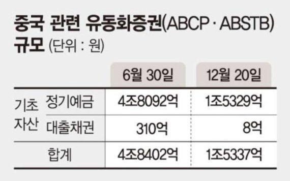 25일 금융투자업계에 따르면 중국 은행 및 기업의 정기예금과 채권 담보를 기초자산으로 한 단기 유동화증권(ABCP·ABSTB) 발행잔액은 1조5337억원(20일 기준)을 가리키고 있다. 올해 6월 말 총 4조8400억원에서 6개월 만에 3분의 1 수준으로 쪼그라든 셈이다.