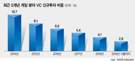 29일 벤처투자정보센터에 따르면 VC 업종별 신규투자 비중에서 게임 분야 수치가 지속적으로 줄어들고 있다. 지난 2014년 10.7% 차지하던 비중이 2015년 8.1%, 2016년 6.6%, 2017년 5.4%, 2018년 4.1%, 올해 11월까지 2.9%로 축소되고 있는 것으로 나타났다.
