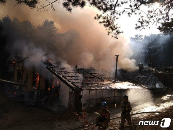 3일 오전 8시23분께 전북 무주군 설천면에 위치한 농촌생활문화체험관에서 화재가 발생해 소방이 진화작업을 벌이고 있다(전북소방본부 제공) 2020.1.3 /뉴스1
