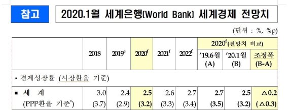 세계경제 성장률이 하향 조정되면서 한국 경제에도 우려가 제기된다. 정부가 올해 경제성장률 전망치를 2.4%로 제시하며 '경기 반등'을 꾀하겠다고 한 주요 근거가 올해 세계 경제 회복이기 때문이다. 여기에 이번 WB 성장률 전망치에는 미·이란 분쟁 상황이 반영되지 않은 만큼 성장률 전망치는 더 떨어질 수 있다.