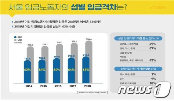 서울에 거주하는 여성 임금노동자의 2018년(상반기 기준) 월평균 임금은 210만원으로, 남성 334만원의 63% 수준이다.