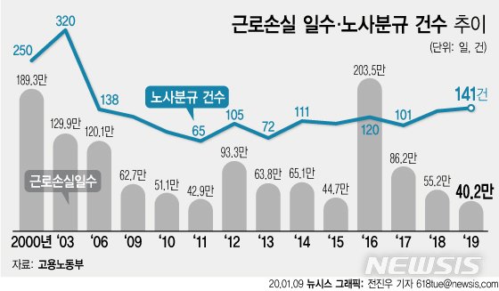 고용노동부가 9일 발표한 '2019 노사관계 통계 분석결과'에 따르면 지난해 노사분규건수는 141건으로 2018년 134건 대비 5.2% 증가했다. 하지만 그로 인한 근로손실일수는 40만2000일로 2018년 55만2000일보다 27.2%로 크게 줄었다.