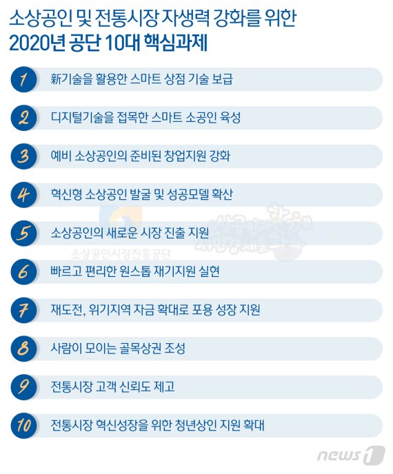 이에 맞춰 Δ신(新)기술을 활용한 스마트 상점 기술 보급 Δ디지털기술을 접목한 스마트 소공인 육성 Δ예비 소상공인의 준비된 창업지원 강화 Δ혁신형 소상공인 발굴 및 성공모델 확산 Δ소상공인의 새로운 시장 진출 지원 Δ빠르고 편리한 원스톱 재기지원 실현 Δ재도전, 위기지역 자금 확대로 포용 성장 지원 Δ사람이 모이는 골목상권 조성 Δ전통시장 고객 신뢰도 제고 Δ전통시장 혁신성장을 위한 청년상인 지원 확대 등을 10대 지원과제로 정했다.