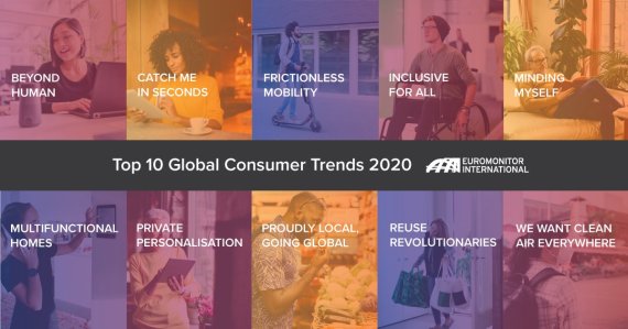 유로모니터가 선정한 10가지 트렌드는 △스마트 휴먼(Beyond Human) △시선 사냥(Catch Me in Seconds) △모빌리티 혁명(Frictionless Mobility) △취향존중(Inclusive for All) △멘탈웰빙(Minding Myself) △홈족 (Multifunctional Homes) △개인정보보호의 진화 (Private Personalisation) △로컬입은 글로벌(Proudly Local, Going Global) △재활용 혁명(Reuse Revolutionaries) △깨끗한 공기, 더 나은 지구(We Want Clean Air Everywhere)다.
