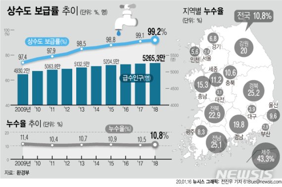 환경부가 16일 공개한 '2018년 상수도 통계'에 따르면 지난 2018년 우리나라 상수도 보급률은 99.2%였다. 이는 전년(99.1%)보다 0.1%포인트 상승한 수치다. 전국에서 5265만3000여명의 인구가 수돗물을 이용하고 있는 것이다.