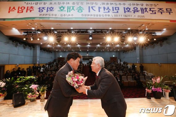 (무주=뉴스1) 김동규 기자 = 송재호 전북 무주군 초대 민선 체육회장 취임식이 17일 무주읍 전통생활문화체험관에서 개최됐다.