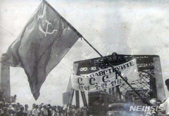[서울=뉴시스] 1945년 8월 26일 평양에 입성한 소련 제25군을 평양 시민들이 대동교 앞에서 소련기와 ‘환영 소련 련합국’이라 쓴 현수막을 들고 환영하고 있다. (사진=미국 국립문서기록청) 2020.01.19. photo@newsis.com 해방 당일 여운형, 안재홍의 주도로 조직된 조선건국준비위원회는 “일시적으로 국제 세력이 우리를 지배할 것이나, 그것은 우리의 민주주의적 요구를 도와줄지언정 방해치는 않을 것”이라고 선언했다. 그러나 예상은 빗나갔다.