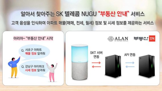 [파이낸셜뉴스] 부동산114는 SK텔레콤 인공지능 스피커인 ‘누구(NUGU)’에 부동산 안내 서비스를 출시했다고 20일 밝혔다.