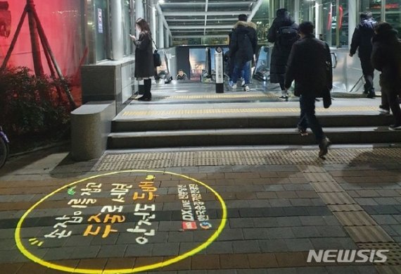 [진주=뉴시스] 정경규 기자 = 경남 진주 한국승강기안전공단이 이용객들이 많은 지하철역 출구에 로고젝트를 활용한 승강기 안전홍보를 실시하고 있어 시민들의 눈길을 끌고 있다.