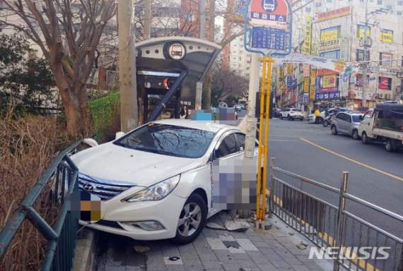[부산=뉴시스] 21일 오후 2시 53분께 부산 사상구의 한 아파트 인근에서 택시가 마을버스 정류장으로 돌진했다.(사진=부산경찰청 제공). 2020.01.21. photo@newsis.com