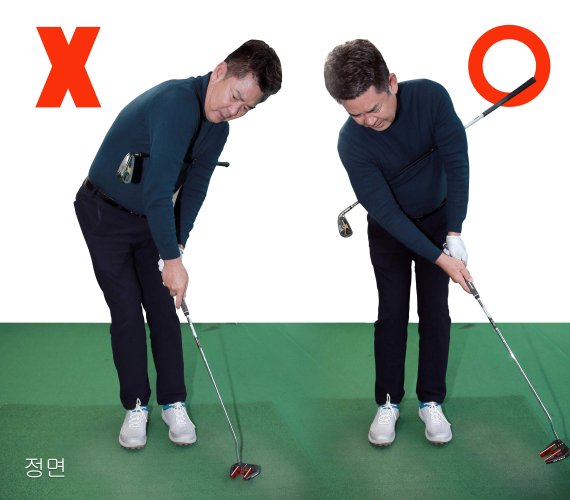 연습방법: 아이언 클럽 하나를 겨드랑이에 끼운다. 임팩트 때 오른쪽 어깨가 밑으로 내려가는 연습을 반복적으로 한다. 오른쪽 어깨가 앞으로 엎어지거나 왼쪽보다 위에 오는 경우는 십중팔구 볼을 먼저 보려 한 것이 원인이다. 특히 쇼트 퍼트일수록 그런 현상이 잦다. 다시말해 쇼트 퍼트일수록 오른쪽 어깨는 낮아야 한다. 그것만 되면 손목 사용 여부는 전혀 신경쓰지 않아도 된다. 겨울에 실내에서도 얼마든지 연습할 수 있는 방법이다.
