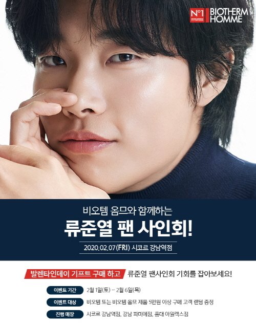 (서울=뉴스1) 김수정 기자 = 밸런타인데이를 맞이해 맨케어 브랜드 비오템 옴므(BIOTHERM HOMME)가 비오템 옴므 모델 류준열과 함께하는 팬사인회 이벤트를 시코르 강남역점에서 2월 7일 개최한다.