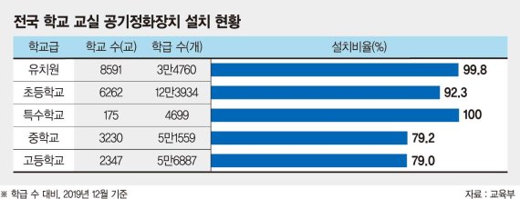 교실에 공기정화와 환기 시설이 설치된 학교라면 고민할 필요가 없겠지만 아직 모든 학급에 설치돼 있지 않다. 교육부 자료에 따르면 지난해 12월 기준으로 초·중·고 전체 27만2486개 학급 중 3만2460개 학급은 환기설비나 공기청정기 어느 하나도 갖추지 못했다. 두가지 모두 갖춘 학급은 2만1668개, 환기설비만 1만7674개, 공기청정기만 20만684개다.