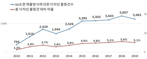 3D도면 제출방식에 의한 디자인출원은 우리나라에서 지난 2010년 전 세계 최초로 시작했다. 출원건수는 794건을 시작으로 2019년 3483건으로 꾸준히 증가추세다.