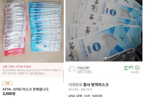 최근 인터넷 중고거래사이트를 중심으로 마스크를 판매한다는 글과 사진이 다수 올라왔다. KF95 마스크 18개를 개당 1800원에, KF80 마스크 17개를 1600원에 판매한다는 것 등이다.