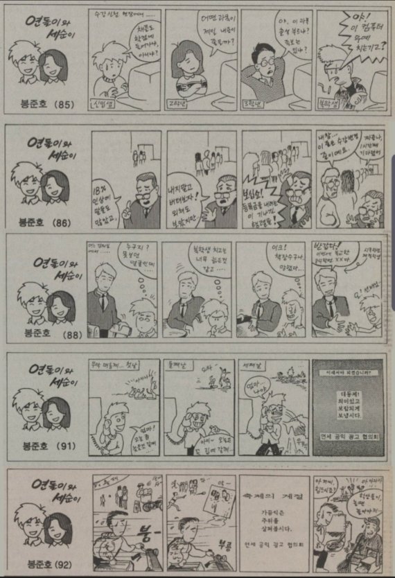 1993년 1학기에는 교내신문인 '연세춘추'에 한 컷 풍자 카툰과 '연돌이와 세순이'라는 네 컷 만평을 그렸다. 한 학기 만에 연재를 그만 두긴 했지만 학교 생활을 하면서 겪을 만한 경험을 네 컷 안에 실감나게 그려 넣어 동문들의 큰 호응을 얻은 것으로 알려졌다.