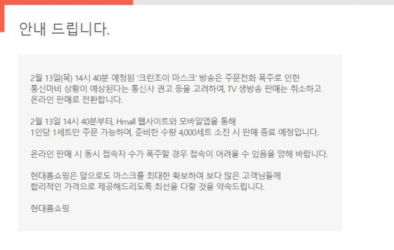 현대홈쇼핑 관계자는 "13일 진행하기로 했던 크린조이 마스크 TV방송의 경우, 방송 시작 30분 전에 문자 메시지로 알려주는 '방송 알림' 서비스 신청 고객이 10만여 명에 달한다"고 설명했다.