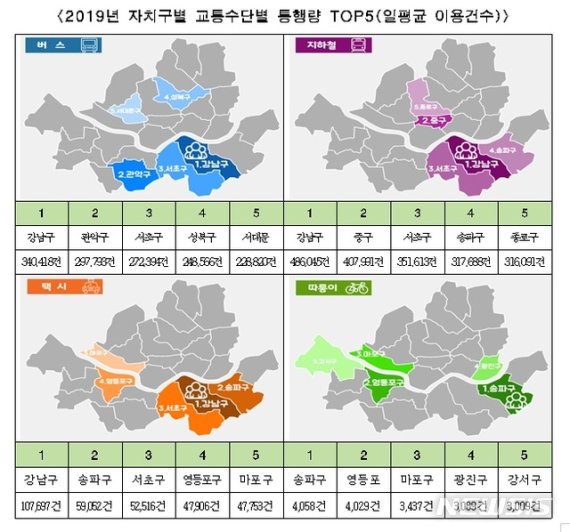 버스 통행량이 가장 높은 자치구는 '강남구, 관악구, 서초구, 성북구, 서대문구' 순이었다. 지하철의 경우 '강남구, 중구, 서초구, 송파구, 종로구'가 가장 통행량이 많았다. 택시 통행량은 강남구, 송파구, 서초구, 영등포구, 마포구 등이 가장 많았다.
