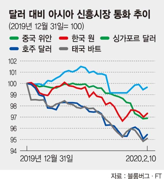 파이낸셜타임스(FT)는 12일(현지시간) 보도에서 올해 초만 하더라도 미국과 중국의 무역합의 덕분에 한껏 오름세를 보였던 신흥시장 통화가 신종 코로나 때문에 추락하고 있다고 진단했다. 반면 미국은 계속되는 달러강세 때문에 금리를 더 낮춰야 하는 상황에 몰렸다.