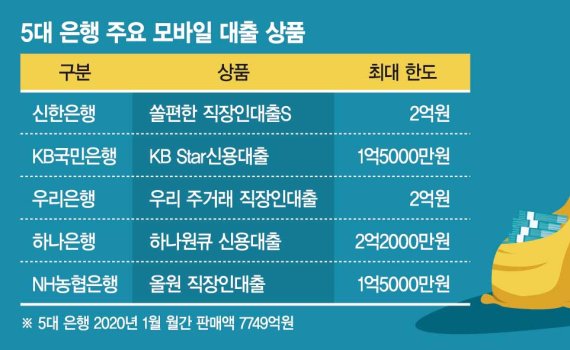 16일 은행권에 따르면 신한·KB국민·우리·하나·NH농협은행 등 5대 은행의 주력 모바일 대출상품 규모를 합산한 결과 올해 1월 한 달간 판매액이 총 7749억원으로 집계됐다. 월간 판매액을 연간 기준으로 환산하면 9조2988억원으로 연 10조원에 육박하는 규모다. 합산 대상 상품은 각 은행의 대표 상품인 '쏠편한 직장인대출S'(신한은행), 'KB Star신용대출'(국민은행), '우리 주거래 직장인대출'(우리은행), '하나원큐 신용대출'(하나은행), '올원 직장인대출'(농협은행) 등 5가지다.
