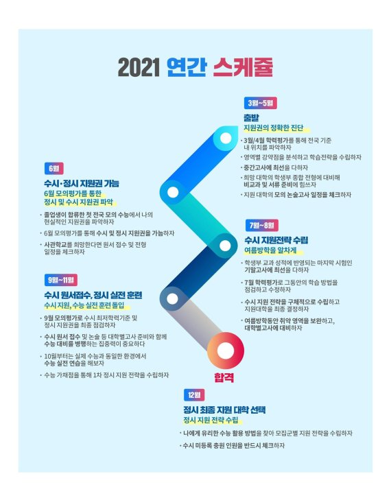이만기 유웨이 교육평가연구소장은 17일 "1년 동안 이어지는 기나긴 입시 레이스를 성공적으로 이끌어 가기 위해서는 우선 한 해 동안 끊임없이 이어지는 굵직한 입시 이슈들을 전체적으로 체크한 후 시기별로 세부적 입시전략과 학습계획을 세우는 것이 필요하다"라고 조언했다.