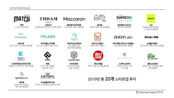 매쉬업엔젤스는 2019년 한 해 동안 20개의 스타트업에 신규 투자를 진행했다. 초기 투자기업에 시드머니를 투자하는 엑셀러레이터 특성장, 지난해 30억원 가량이 투자된 것으로 추정된다.