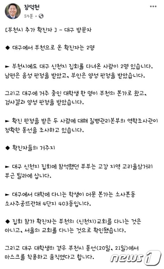 또 B씨는 대구에 거주 중인 대학생으로 본가인 부천을 방문했다가 코로나19 의심 증상이 나타나 검사 결과 '양성' 반응이 나타났다.