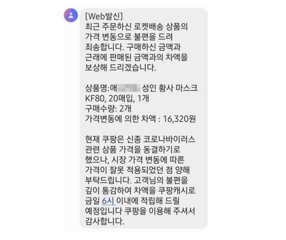이에 따라 쿠팡은 고객들에게 "현재 쿠팡은 관련 상품 가격을 동결하기로 했으나 시장 가격 변동에 따른 가격이 잘못 적용되었던 점 양해 부탁드린다"고 메시지를 발송했다.