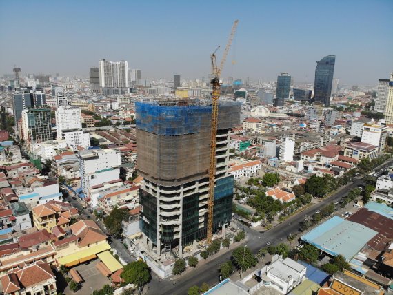 지난 2월 25일 방문한 캄보디아의 수도 프놈펜 중심상업지구 내 노르돔 대로 인근 사타파나 은행 본점 신축공사 현장. 더운 날씨임에도 8월 준공을 맞추기 위해 직원들 모두 작업복이 흠뻑 젖을 정도로 구슬땀을 흘리고 있었다.